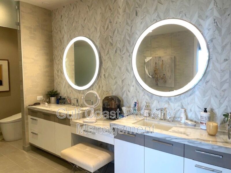 The elegant owner’s suite offers a private sanctuary with a spacious walk-in closet featuring custom wardrobe cabinetry, a frameless walk-in shower, and a secluded water closet. A private elevator with keyless entry provides direct access from your private two-car garage into your residence for ultimate convenience and privacy.